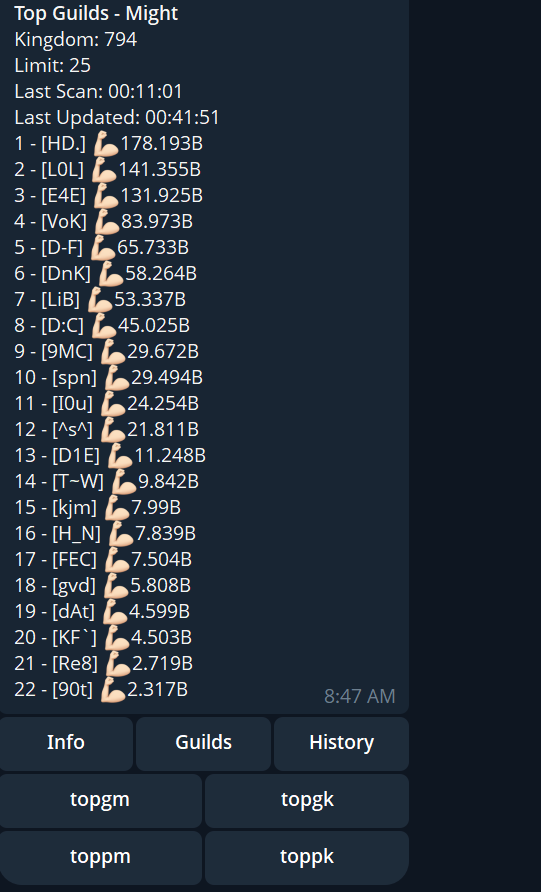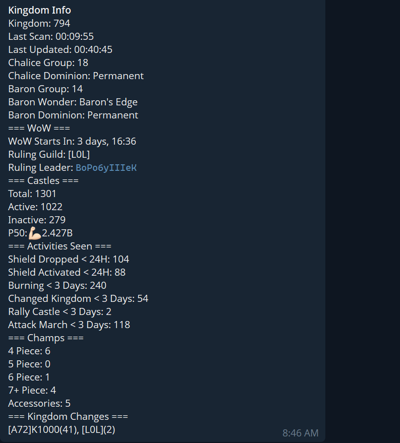We create a dedicated Telegram group for you under the War/Track Bot system. Once the group is created, full command access is provided to you so you can easily control and manage the bot and group. Inside the Telegram group, you can: Send command to bot and check activity of castle. Track performance and activities instantly Control everything directly from Telegram (no extra software needed) Enjoy 24/7 automated bot operation Our system is designed to be secure, fast, and user-friendly, making bot management simple even for beginners. 👉 You stay in control. The bot works for you.